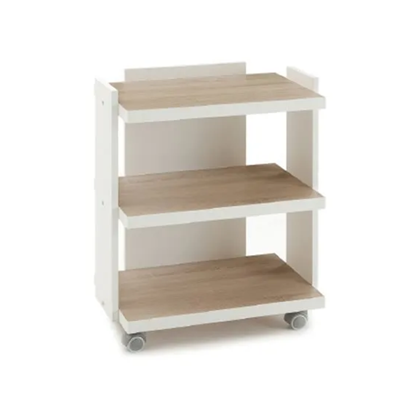Carrello realizzato in nobilitato bianco opaco con ripiani disponibili in due diverse finiture. Lineare e semplice, che si adatta facilmente ad ogni tipo di ambiente. Il piano superiore durante la fase di montaggio può essere posizionato a filo struttura, soluzione ideale come piano d’appoggio per i macchinari.