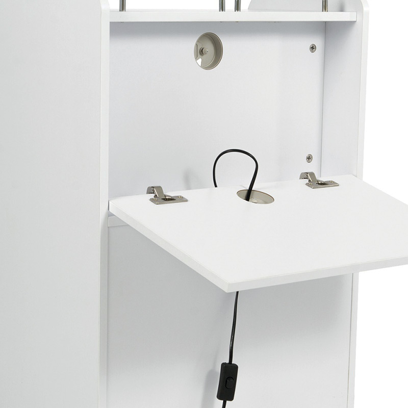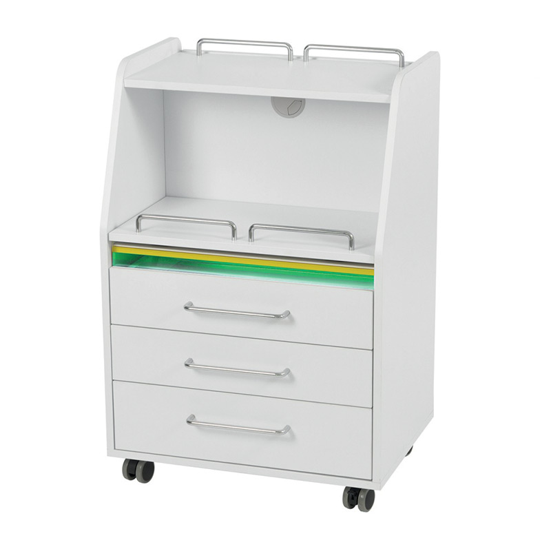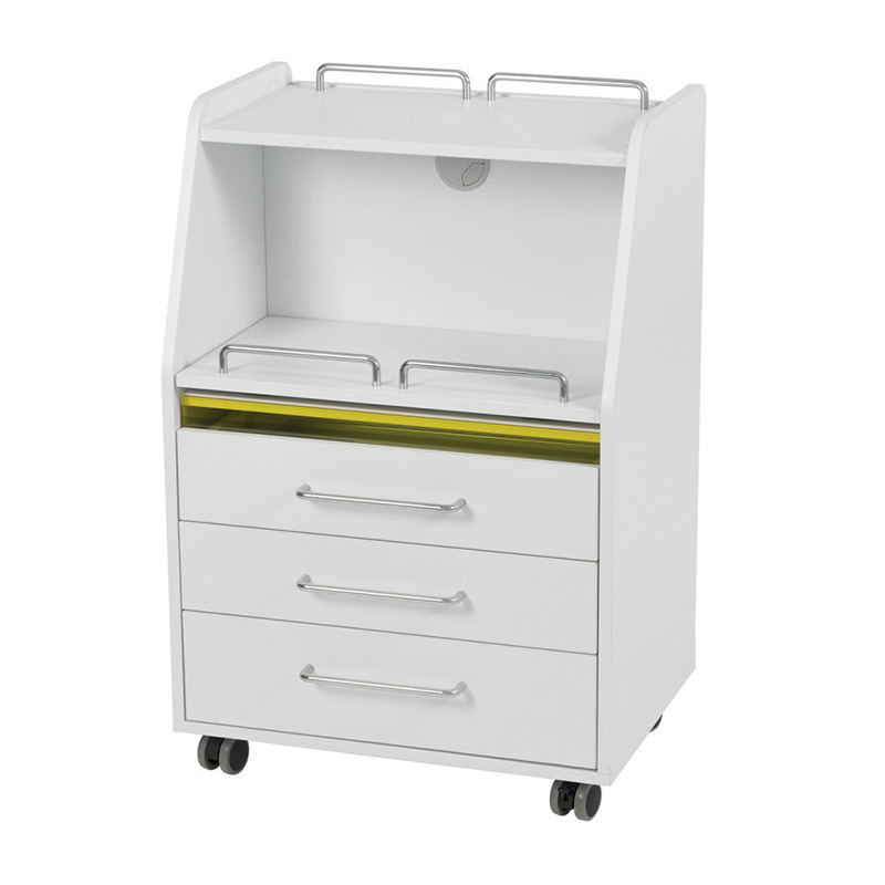 Carrello podologico bianco in legno compensato a 3 cassetti, uno dei quali è fornito di luce UV per la sterilizzazione degli strumenti. È dotato anche di uno spazio centrale con ripiano estraibile dove poter posizionare il micromotore o altra attrezzatura da lavoro, e 4 ruote per facilitarne gli spostamenti.