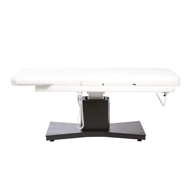 Lettino elettrico dotato di 3 motori che ne regolano l’altezza e l’inclinazione dello schienale e del poggiapiedi, tramite telecomando. Completo di braccioli, cuscino con foro viso e portarotolo. Tappezzeria in PU di alta qualità, facile da pulire, e base in legno.