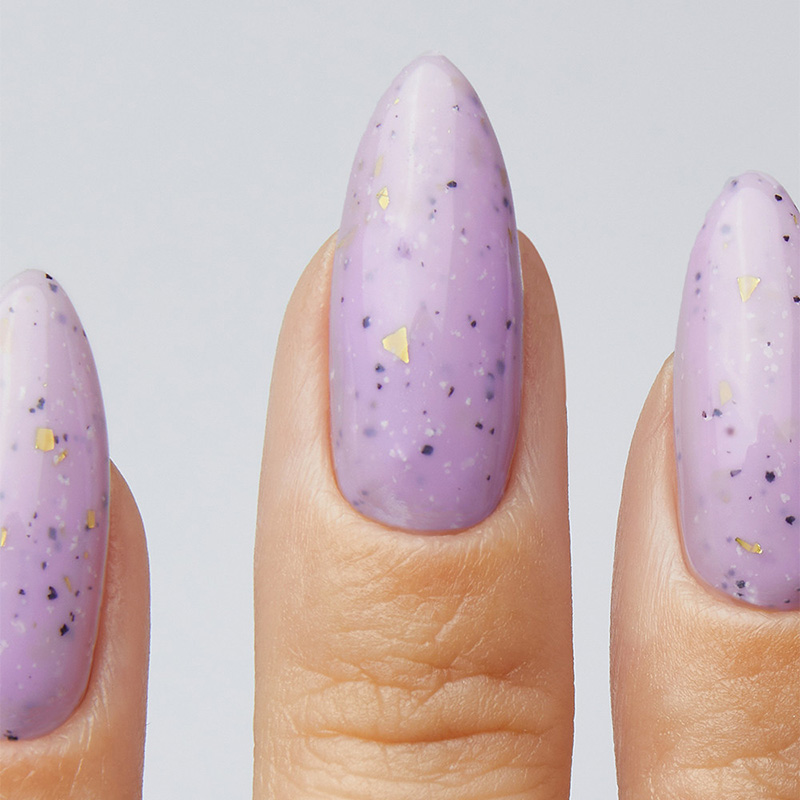 Morbido viola pastello con foglie oro e nere, per una finitura chic. Bello come il sole che tramonta sui pittoreschi campi di lavanda, una cartolina dalla Provenza.