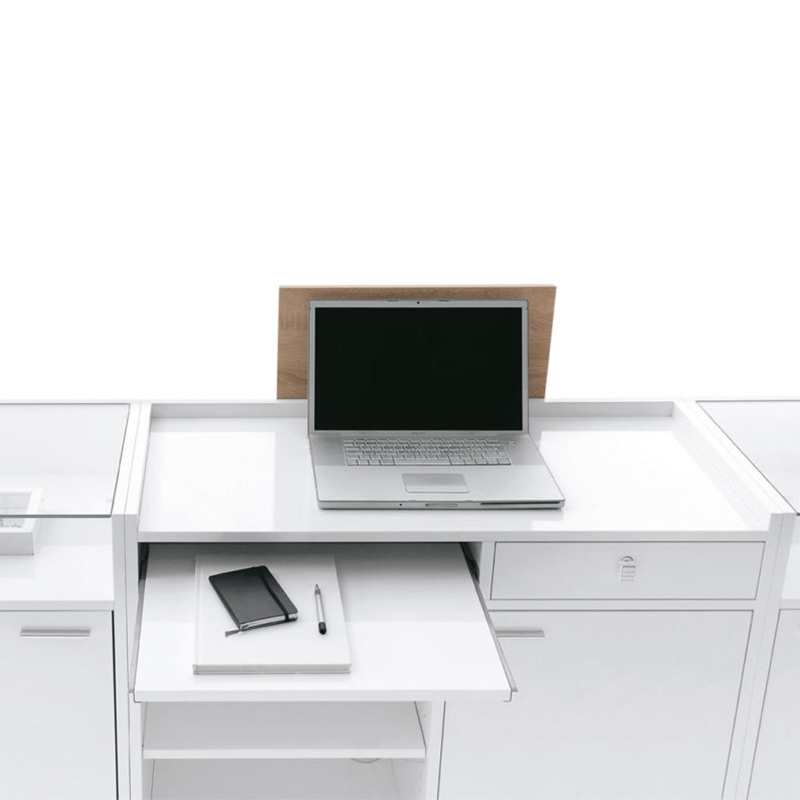 Reception realizzata in nobilitato bianco lucido con dettagli frontali disponibili in larice bianco, wengé naturale, rovere bardolino. La reception può essere composta dal solo modulo centrale oppure è possibile aggiungere una o due vetrine espositive. I moduli con vetrinetta espositiva possono essere posizionati sulla destra e sulla sinistra. Il modulo fisso centrale è dotato di piano estraibile portaplanning, foro passacavi, cassetto con chiusura, vano giorno e anta con ripiano.