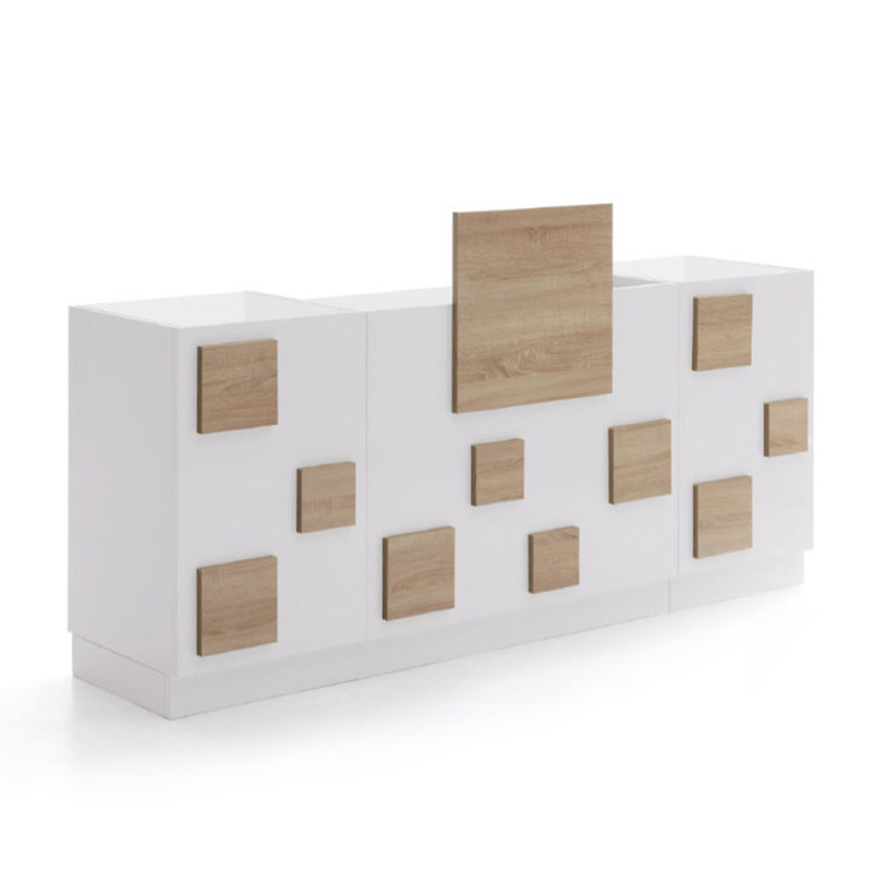 Reception realizzata in nobilitato bianco lucido con dettagli frontali disponibili in larice bianco, wengé naturale, rovere bardolino. La reception può essere composta dal solo modulo centrale oppure è possibile aggiungere una o due vetrine espositive. I moduli con vetrinetta espositiva possono essere posizionati sulla destra e sulla sinistra. Il modulo fisso centrale è dotato di piano estraibile portaplanning, foro passacavi, cassetto con chiusura, vano giorno e anta con ripiano.