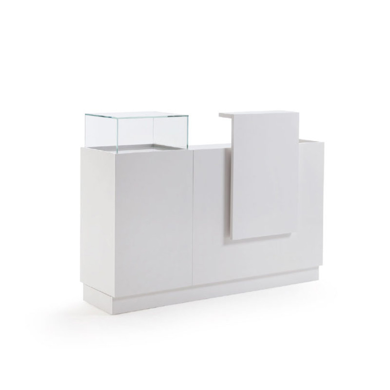 Reception dal design minimal ed elegante, realizzata in nobilitato bianco lucido. Può essere composta dal solo modulo centrale oppure