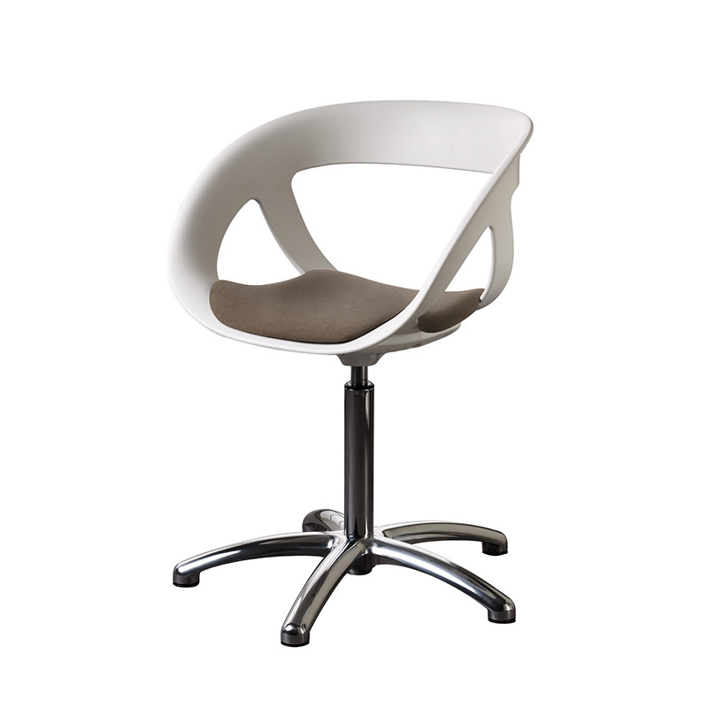 Elegante e comoda poltrona con seduta realizzata in tecnopolimero. Base cromata e altezza regolabile. La seduta è completa di cuscino imbottito con rivestimento personalizzabile.