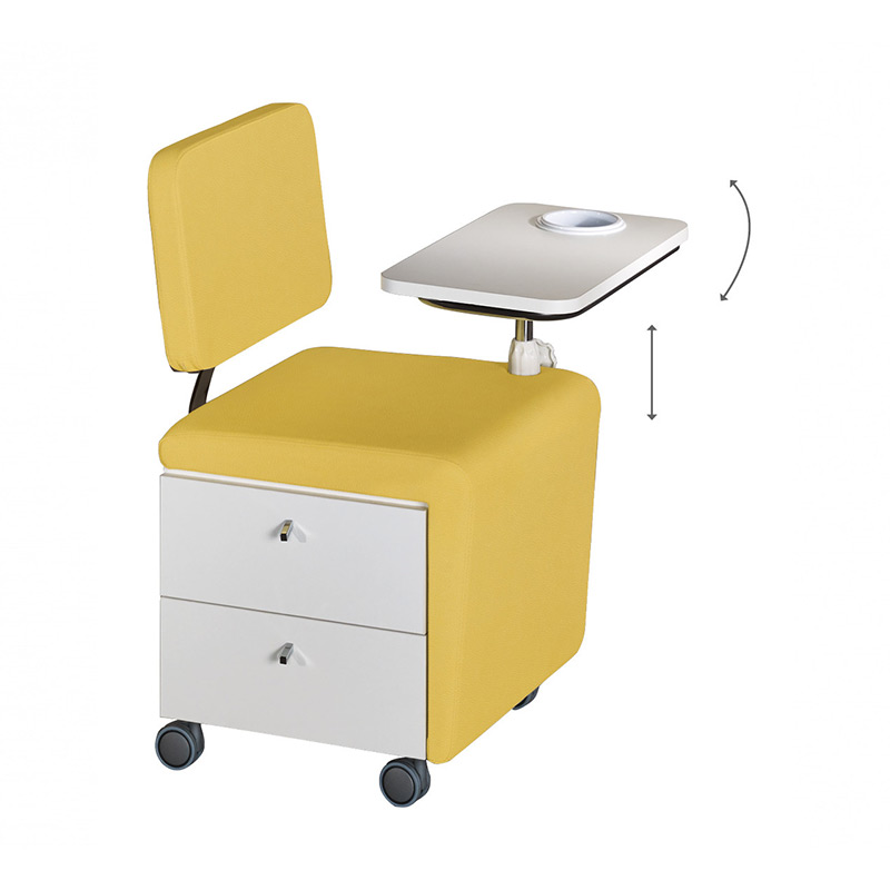 Piccola postazione manicure, nata per adattarsi alle esigenze dei saloni che non hanno a disposizione molto spazio ma che comunque vogliono offrire questo servizio ai loro clienti. Struttura in nobilitato bianco frassinato, schienale regolabile e seduta imbottita e rivestita in skai disponibile in diversi colori. Completa di ruote e due ampi cassetti dove poter riporre tutti gli smalti e gli strumenti necessari. Ha inoltre un piano d’appoggio in legno, regolabile in altezza dotato di vaschetta.