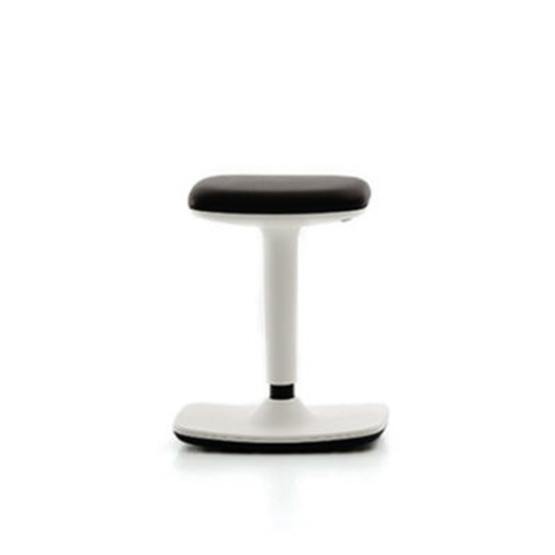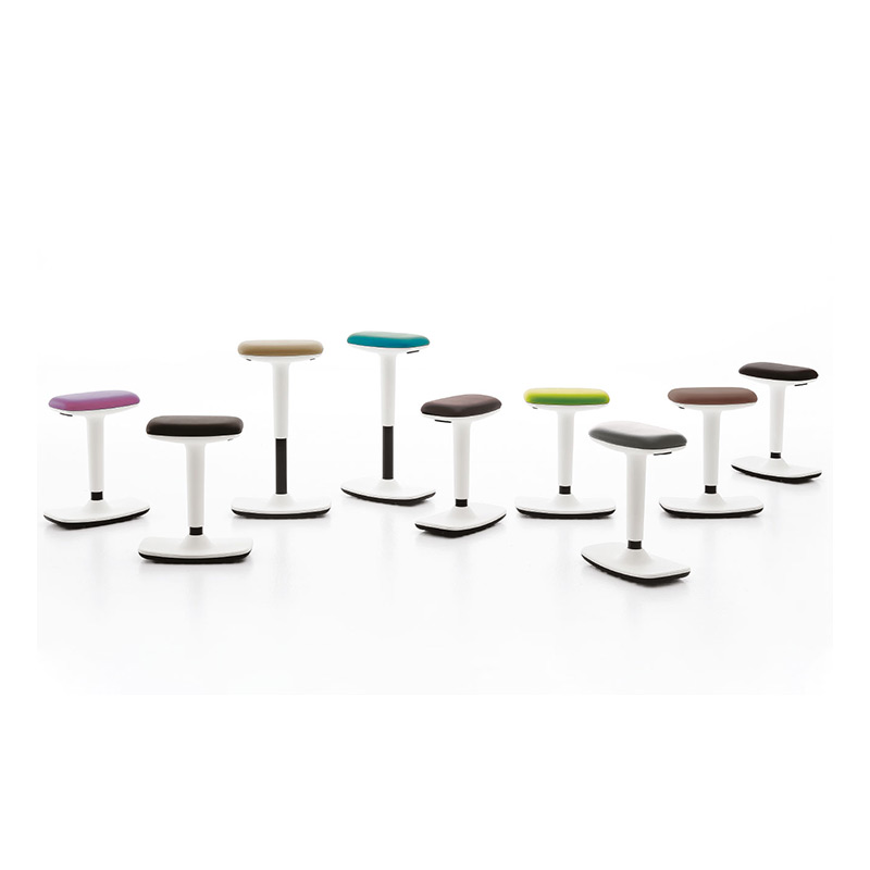Sgabello oscillante con sedile schiumato e rivestimento disponibile in 12 colori skai. È dotato di doppio pulsante per la regolazione in altezza (escursione 230 mm). La base è in gomma anti-stridio
