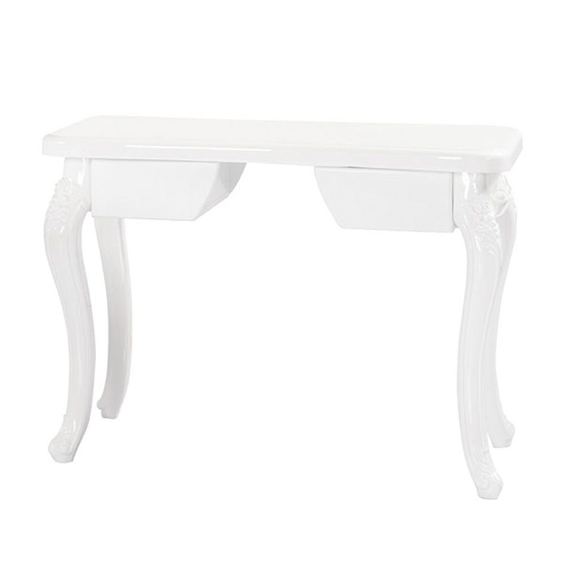 Tavolo Nails elegante e chic in legno laccato bianco. Dotato di 2 cassetti e spina elettrica per collegare accessori e strumenti di lavoro.