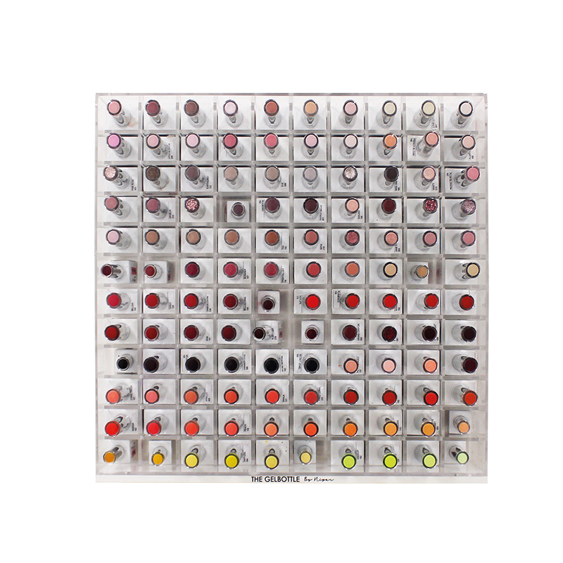 Espositore da muro in plexiglass colato, spessore 4 mm, di prima qualità. Taglio laser e colla UV assemblato a mano. Base bianca serigrafata The GelBottle, spessore 8 mm.